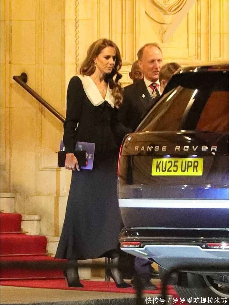 当天凯特王妃身穿一件装饰了白色蕾丝领的黑色连衣裙,首饰则是选择了曾经属于伊丽莎白女王的珍珠和钻石耳环,胸针则是今年5月份王妃首次命名的皇家海军舰艇HMS Glasgow勋章。